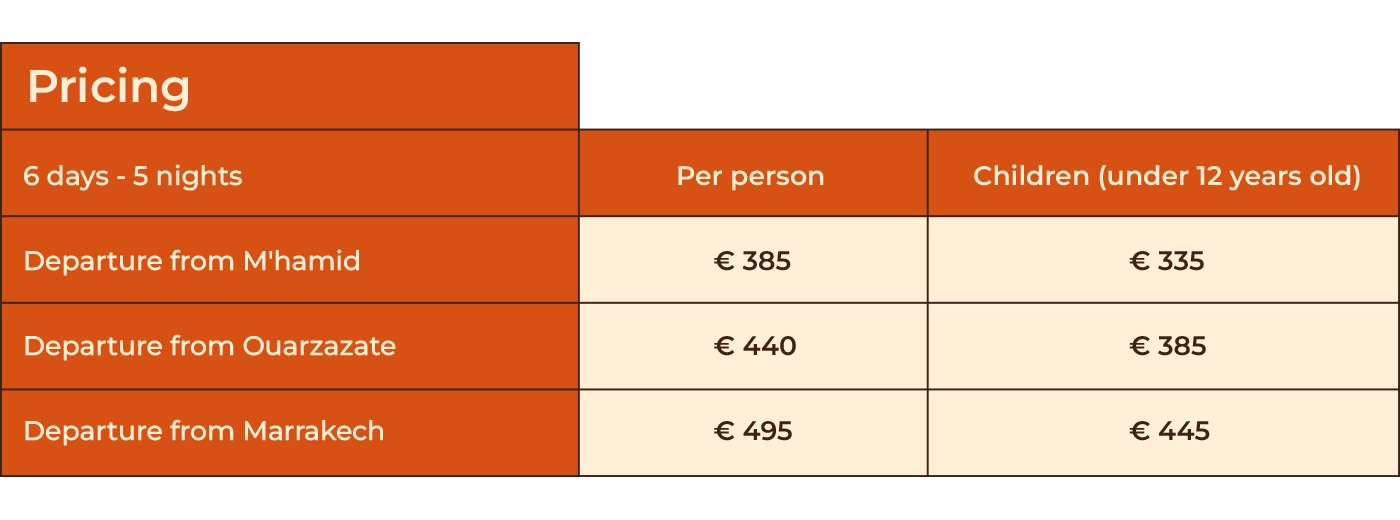 - Overnight stay in a comfortable fixed bivouac in M'hamid (the night before the trek starts)