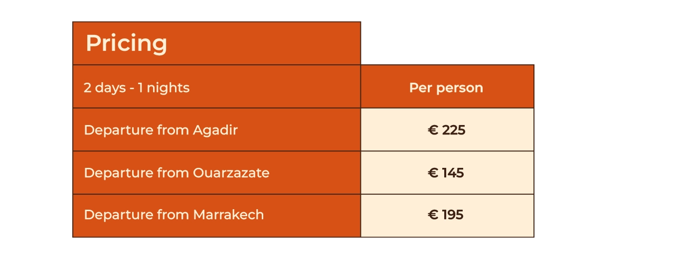 A 2-day, 1-night desert excursion from Marrakech, Agadir, and Ouarzazate.