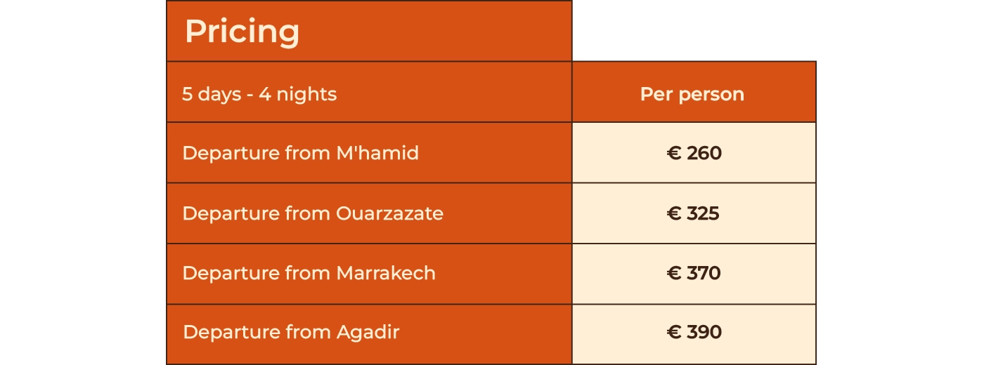 Our recommendation for a return to Marrakech or Agadir: Opt for an additional night at the fixed camp on Day 5 (take the time to enjoy a hammam, discover the peaceful atmosphere of the village of Mhamid, visit the Kasbah and its palm grove, have tea with locals, get a henna tattoo) and return to Marrakech on Day 6 (return to Marrakech / Agadir scheduled during the day). [and / or] Opt for an additional night halfway (towards Ouarzazate) to make visits along the way and balance travel times (return to Marrakech / Agadir scheduled on Day 6 in the late morning or late afternoon, as desired).