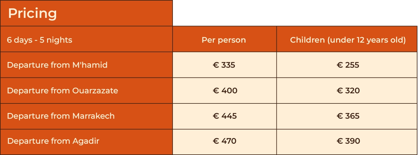 - Round-trip transportation from Marrakech / Ouarzazate / Agadir.